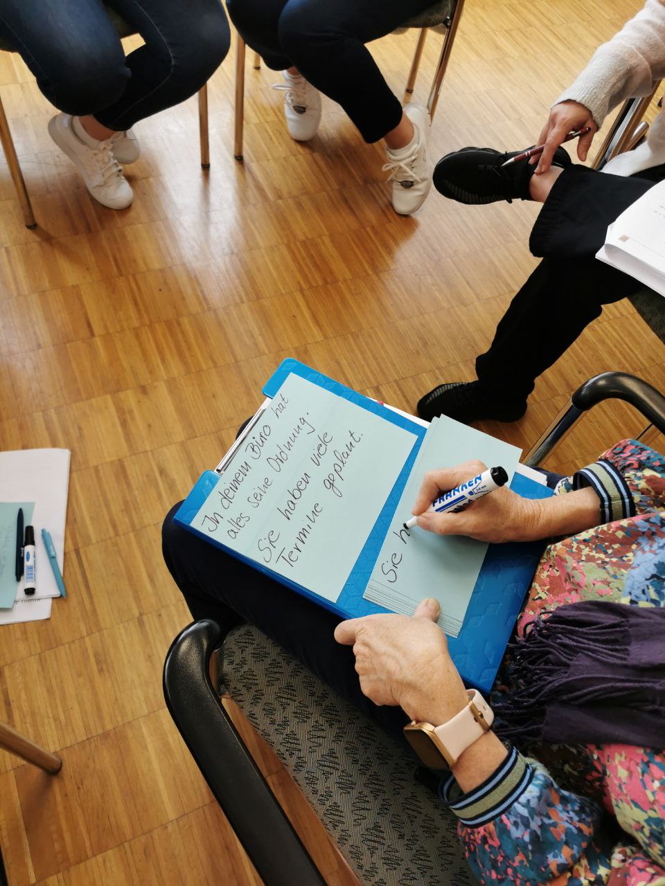 In einer lebendigen und offenen Lernatmosphäre wurde intensiv gearbeitet, reflektiert und gelacht. Auf Flipcharts und Moderationskarten entstanden schnell validierende Sätze und Schlüsselwörter – Bausteine, um Lebensthemen für die praktische Umsetzung in Kurzbegegnungen zu erarbeiten.